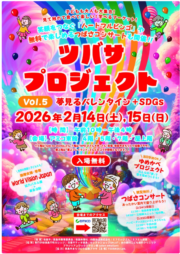 徳島駅前では、年間を通じて多種多様なイベントを開催しております。 2月14日(土)・15日(日)にアミコビル東館にて、「ツバサプロジェクト Vol.5」が開催されます。 イベントに参加の際は是非、駅前周辺での買い物や新町川・眉山等の景観も楽しんでください。